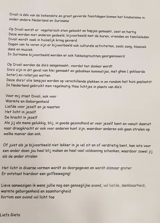 In het kader van Diwali 2018 heeft de Chote Foundation in samenwerking met Resto van Harte in Kanaleneiland te Utrecht een diner georganiseerd. De vrouwengroep van het Vriendennetwerk van Power by Peers nam met 15 dames deel. Het diner werd opgesierd met een prachtige diwali-gedicht van Gieta Sadhoeram. De bezoekers hebben heerlijk genoten van een driegangenmenu.